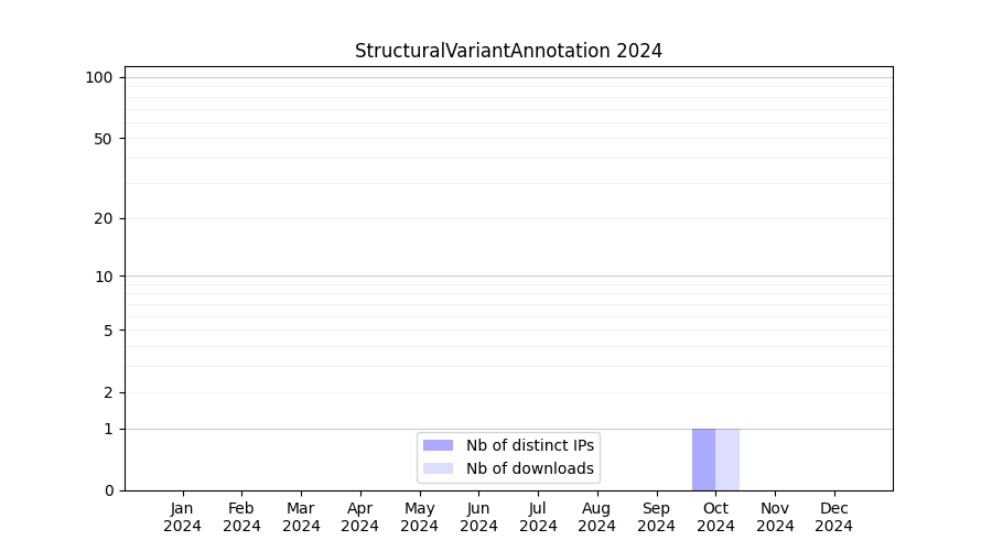 Number of downloads for annotation package StructuralVariantAnnotation, year by year, from 2025 back to 2014 (years with no downloads are omitted):