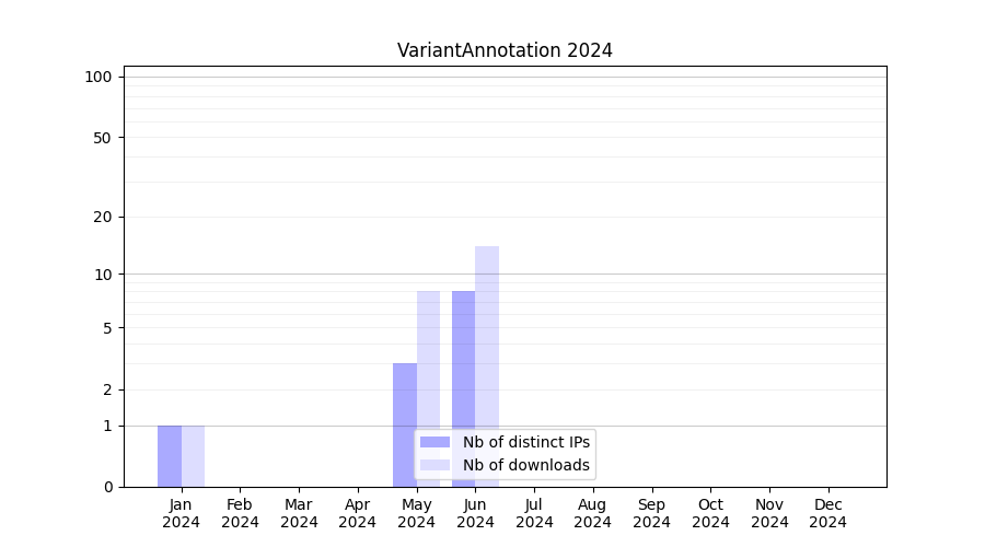 Number of downloads for annotation package VariantAnnotation, year by year, from 2025 back to 2014 (years with no downloads are omitted):