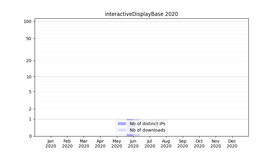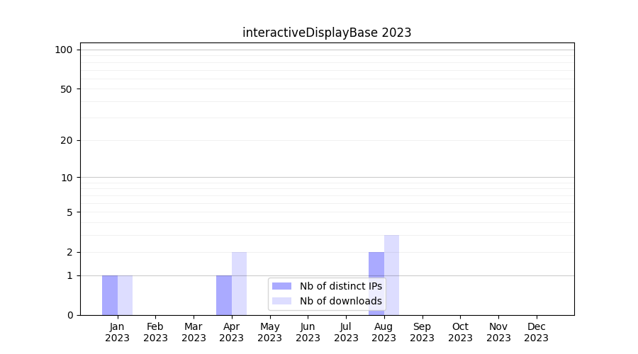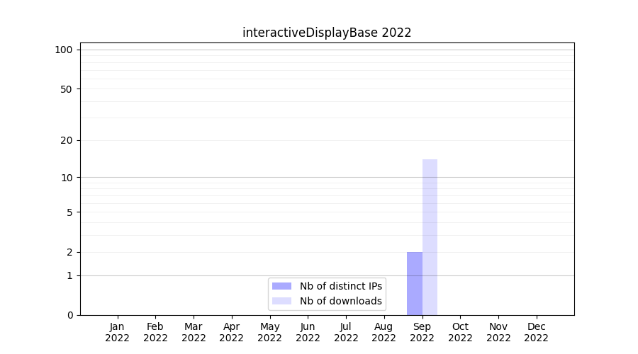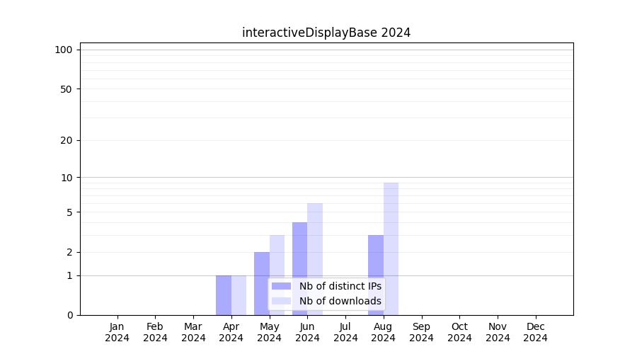 Number of downloads for annotation package interactiveDisplayBase, year by year, from 2025 back to 2014 (years with no downloads are omitted):