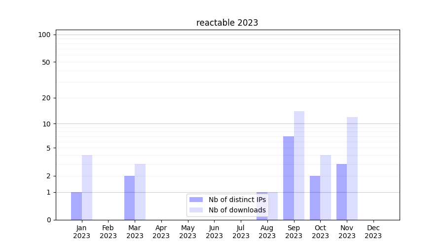 Number of downloads for annotation package reactable, year by year, from 2025 back to 2014 (years with no downloads are omitted):
