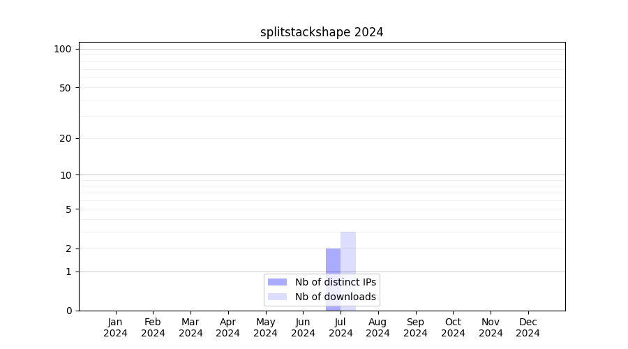 Number of downloads for annotation package splitstackshape, year by year, from 2025 back to 2014 (years with no downloads are omitted):