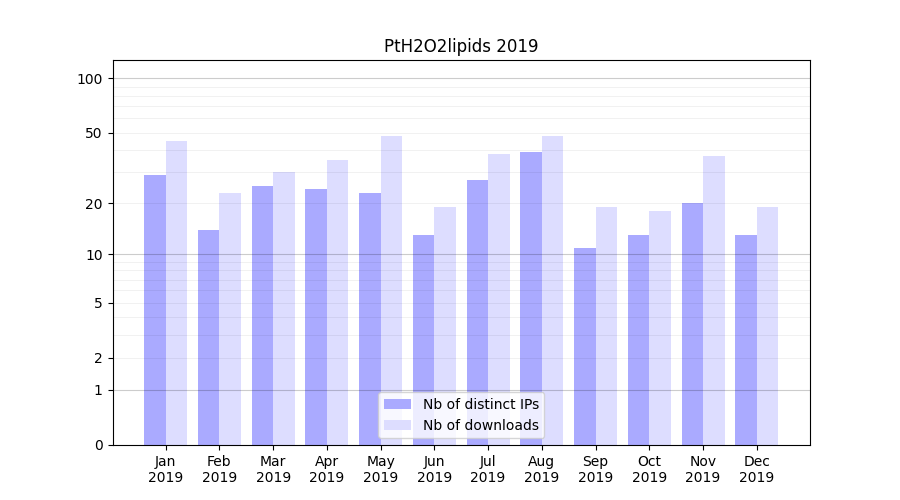 Number of downloads for experiment package PtH2O2lipids, year by year, from 2025 back to 2014 (years with no downloads are omitted):