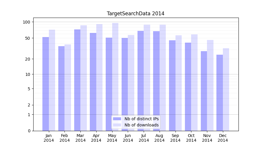 Number of downloads for experiment package TargetSearchData, year by year, from 2025 back to 2014 (years with no downloads are omitted):