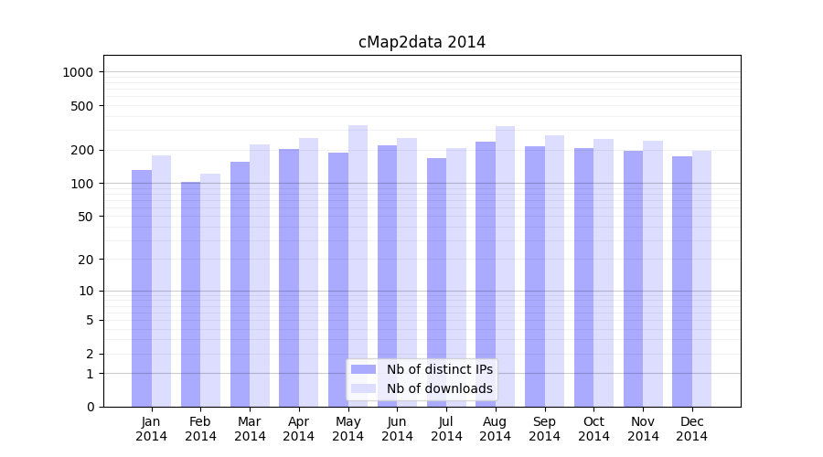 Number of downloads for experiment package cMap2data, year by year, from 2025 back to 2014 (years with no downloads are omitted):