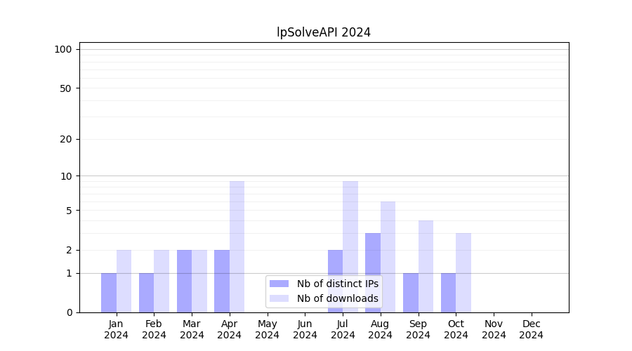 Number of downloads for experiment package lpSolveAPI, year by year, from 2025 back to 2014 (years with no downloads are omitted):