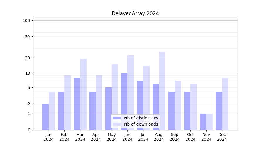 Number of downloads for workflow package DelayedArray, year by year, from 2025 back to 2015 (years with no downloads are omitted):