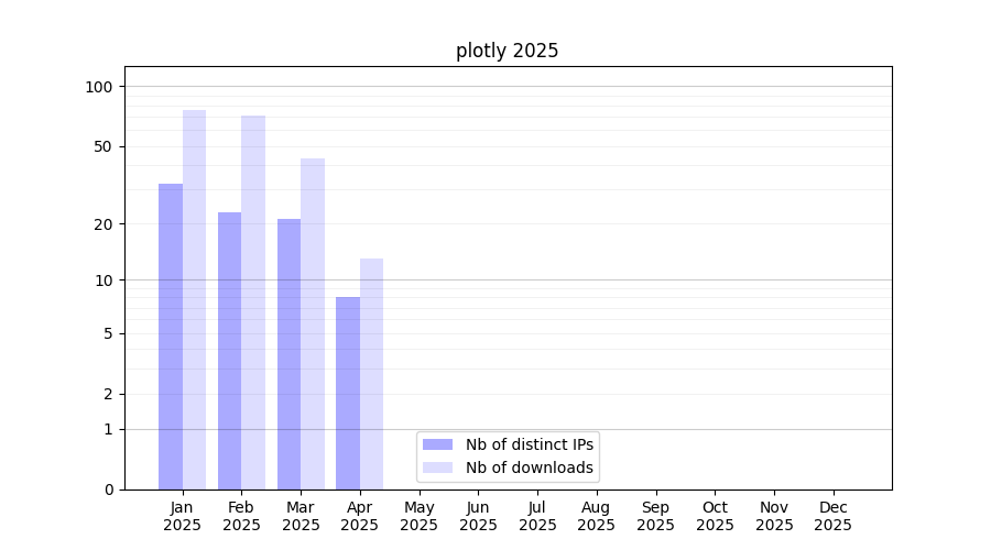 Number of downloads for workflow package plotly, year by year, from 2025 back to 2015 (years with no downloads are omitted):