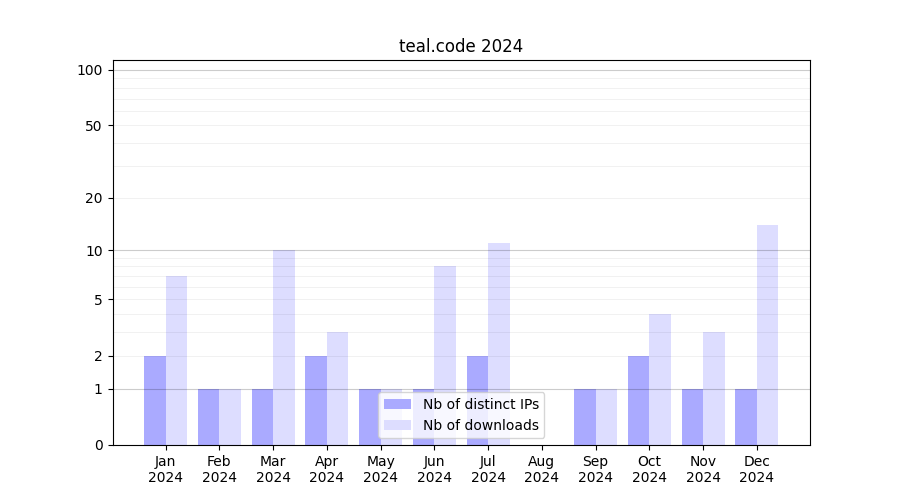 Number of downloads for workflow package teal.code, year by year, from 2025 back to 2015 (years with no downloads are omitted):